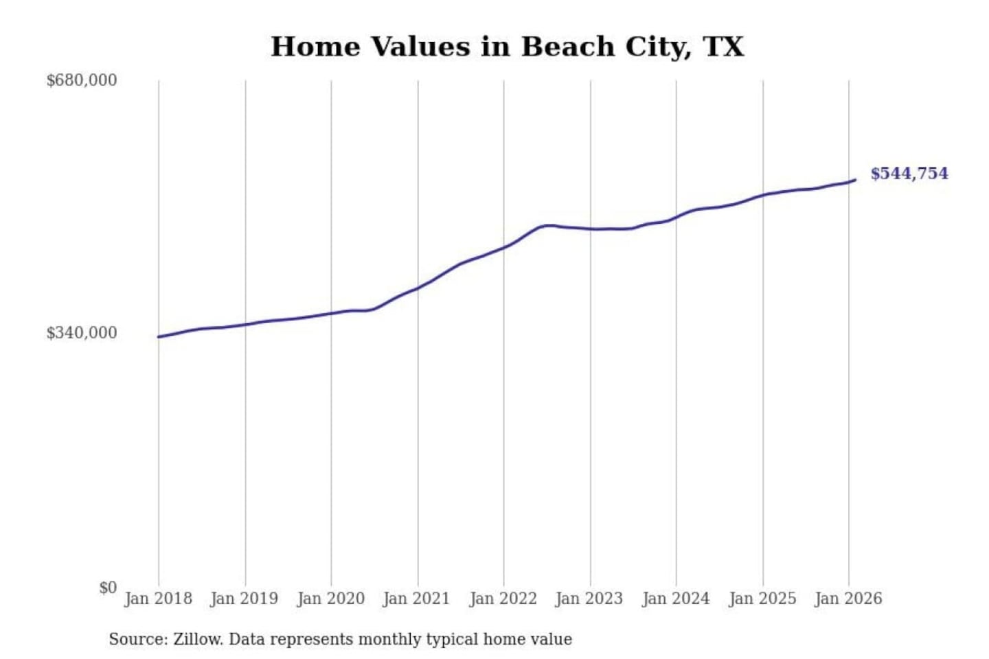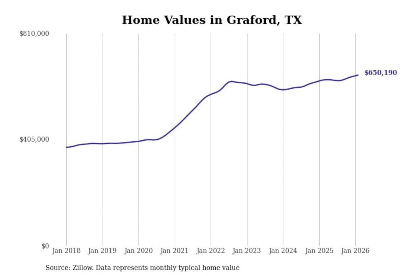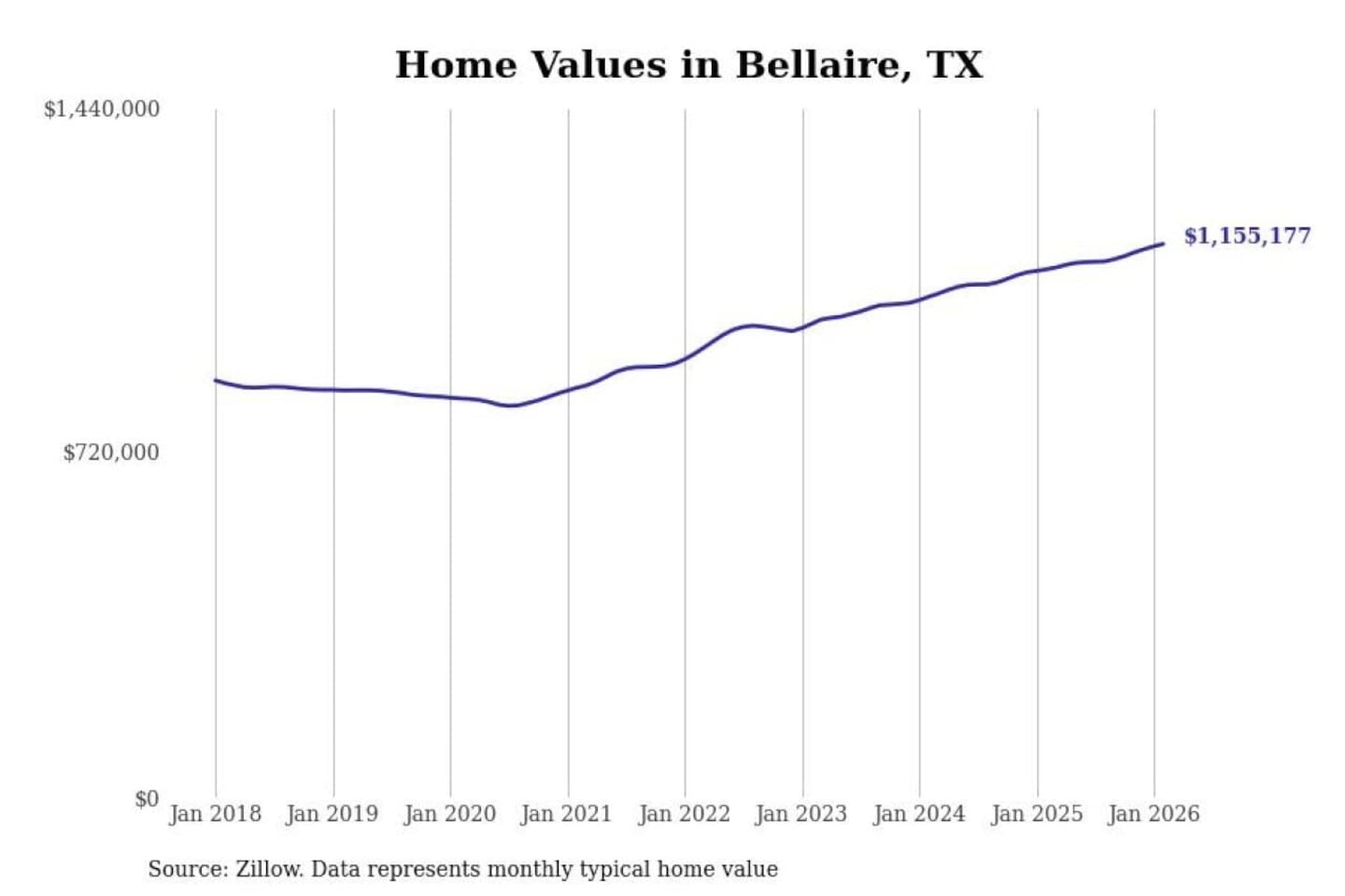 Stacker compiled a list of cities with the fastest-growing home prices in Texas using data from Zillow. Cities are ranked by the dollar change in the Zillow Home Values Index for all homes from the 12 months ending February 2026. The charts in this story were created automatically using Matplotlib. Data was available for 50 cities and towns in Texas.