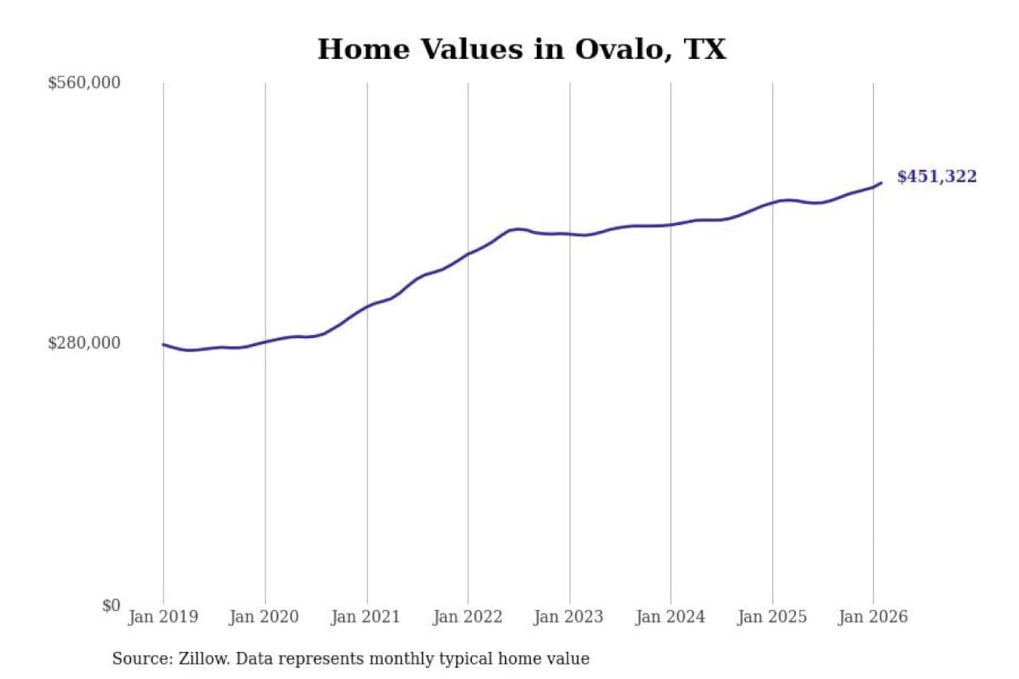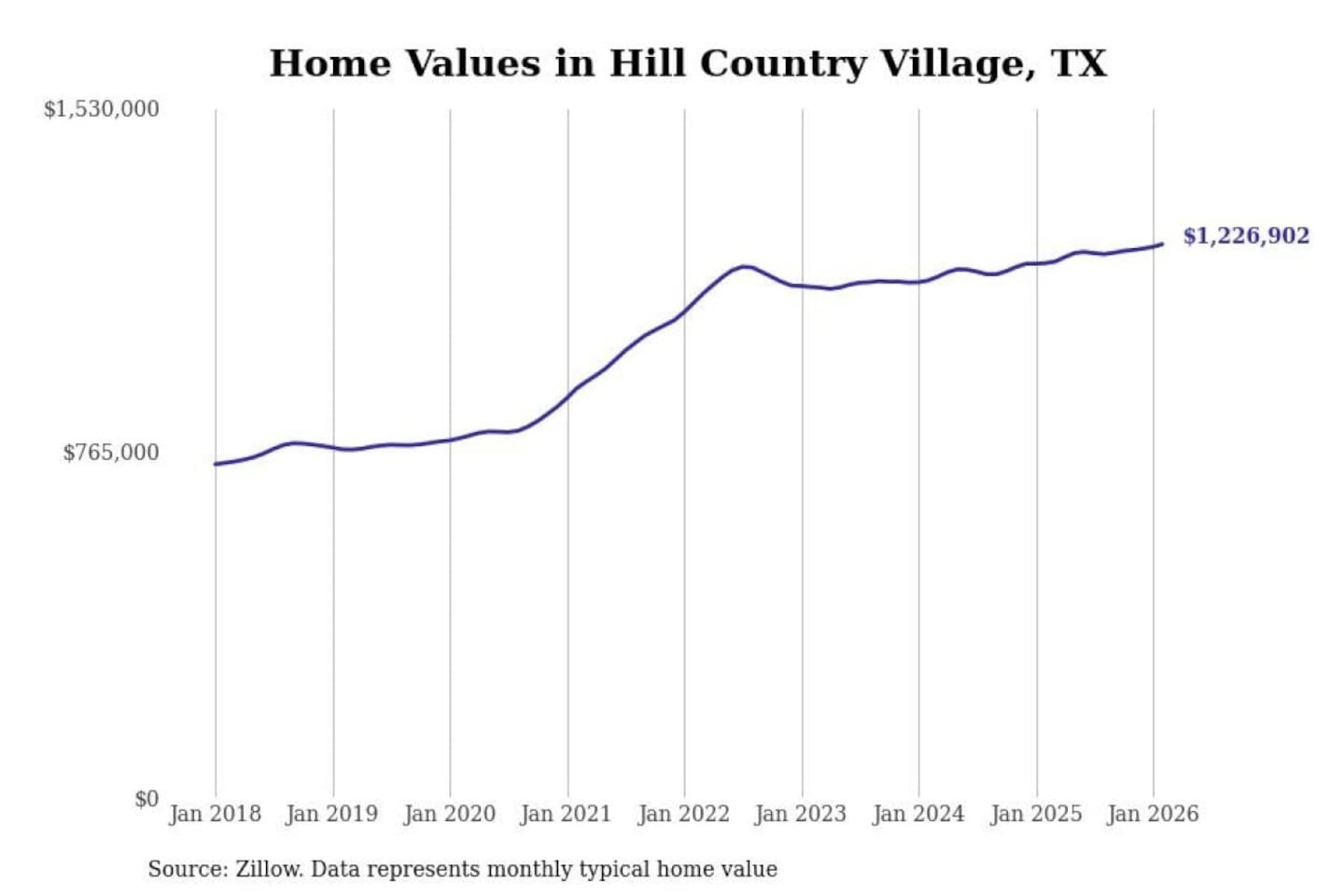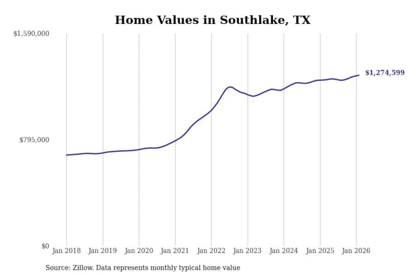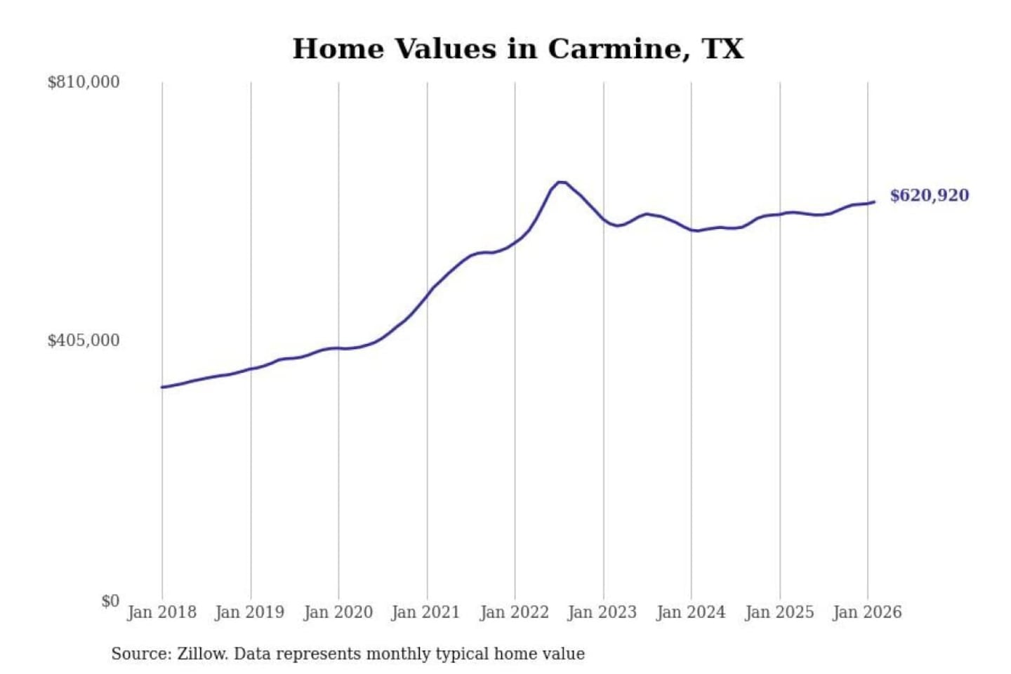 Stacker compiled a list of cities with the fastest-growing home prices in Texas using data from Zillow. Cities are ranked by the dollar change in the Zillow Home Values Index for all homes from the 12 months ending February 2026. The charts in this story were created automatically using Matplotlib. Data was available for 50 cities and towns in Texas.