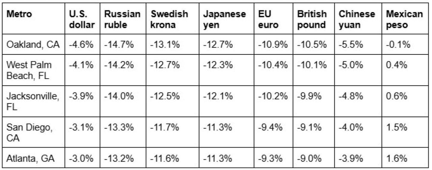 The foreign currency advantage is even stronger in markets where home prices are falling. Among the 100 largest metros, these five saw the biggest year-over-year price drops in June, which correlate to the most savings.