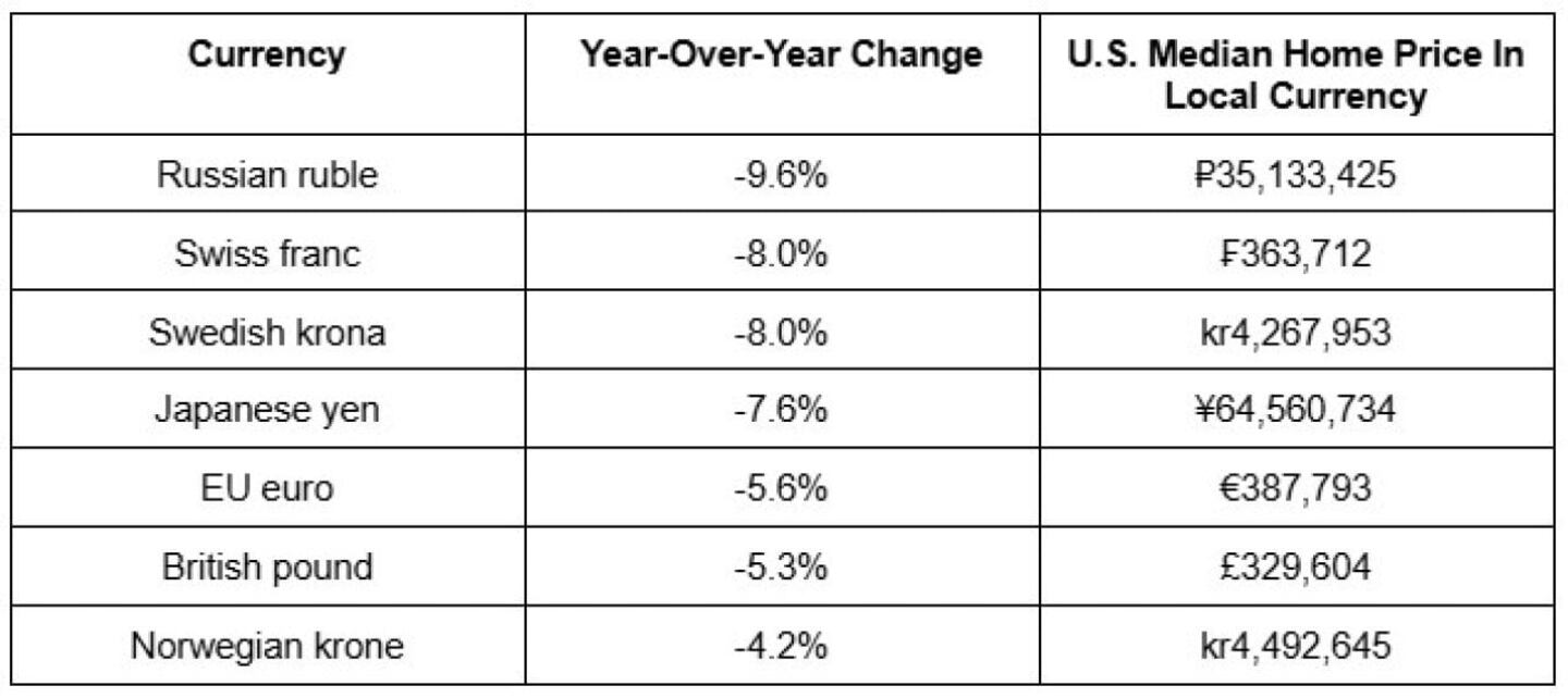 According to a Redfin analysis of exchange rates for a selection of major foreign currencies against the U.S. dollar. The analysis converts the median U.S. home price into the equivalent value in foreign currencies using monthly average exchange rates. All data as of June 2025.