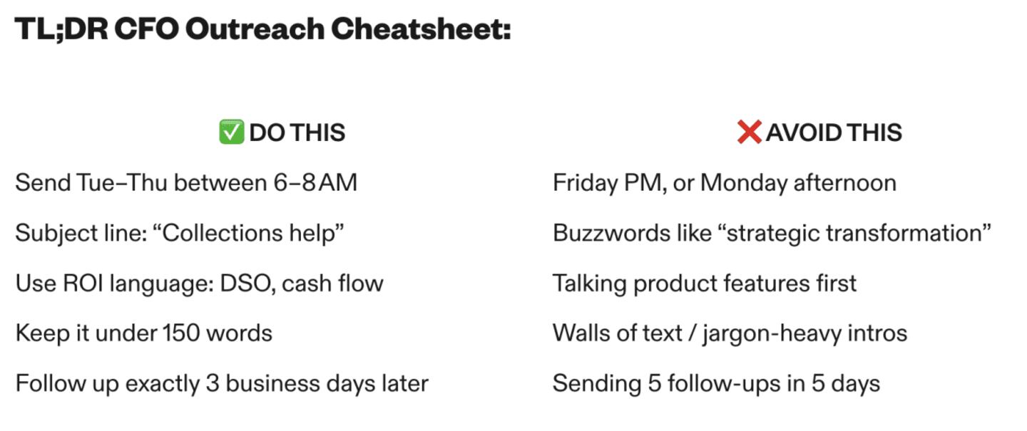 The good news? Once they engage, CFOs tend to convert faster. Why? Because they own the outcomes you’re promising: reduced days sales outstanding, faster collections, tighter receivables.