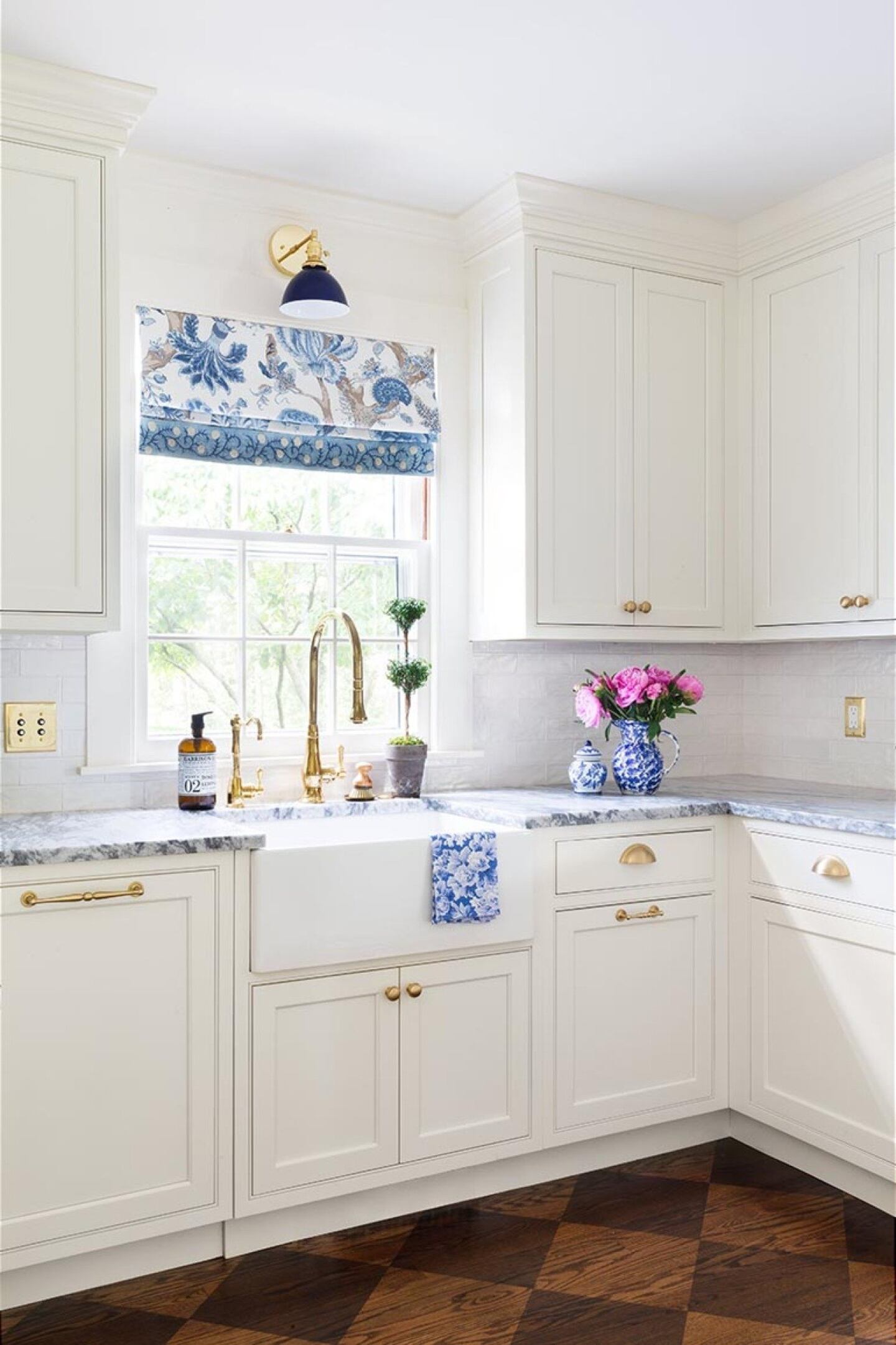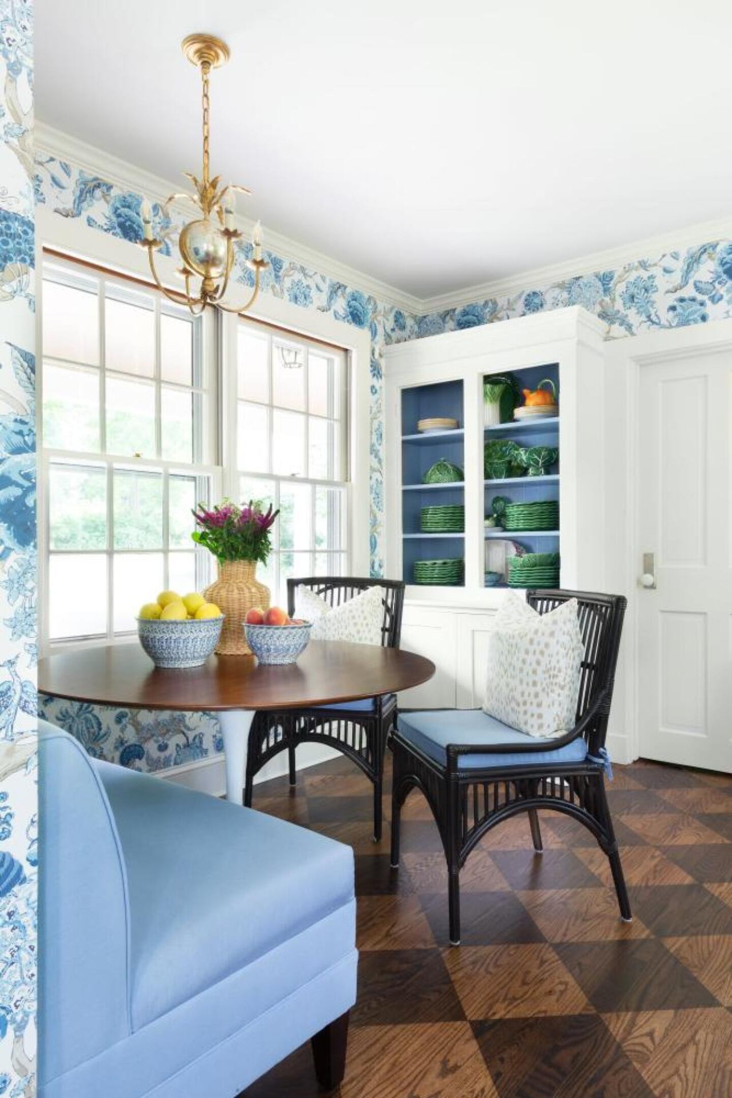 The hardwood floors, stained in a harlequin pattern, introduce a geometric design that draws the eye to the kitchen. This flooring pattern adds a sense of dynamism and playfulness to the space, creating an engaging visual element that contrasts beautifully with the kitchen's classic elegance.