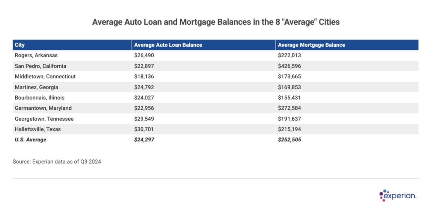When it comes to credit and finances, knowing what's considered "average" can help consumers determine whether they're in need of a course correction. To better understand what average looks like in real life, Experian took a look at the eight cities in the U.S. most aligned with the national average in terms of credit score, credit card debt and credit usage. Mortgage and auto loan balances were also compared to highlight the importance of regional factors.