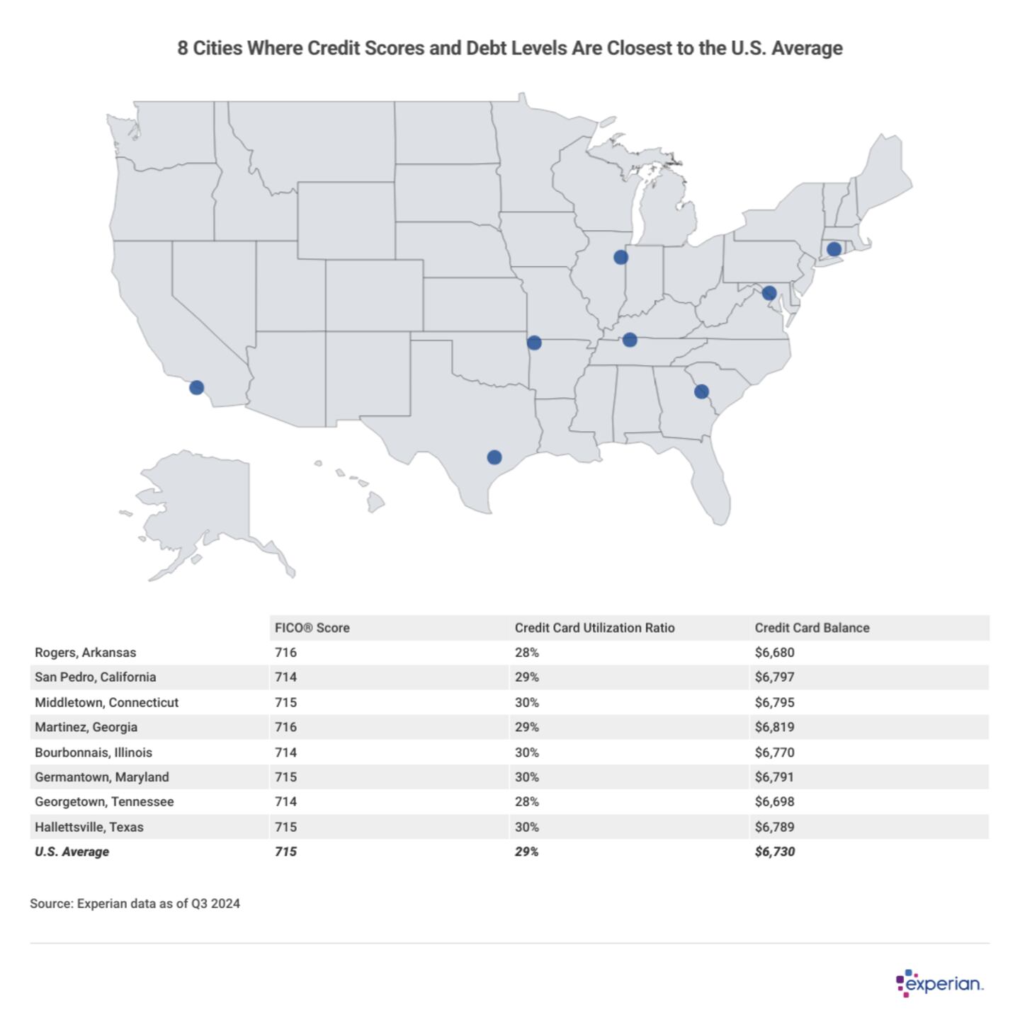 Using aggregated, anonymized data of consumers, and only looking at cities with at least 2,500 consumers with credit card accounts, Experian identified eight cities in the U.S. that approximate the national average, at least in terms of credit.