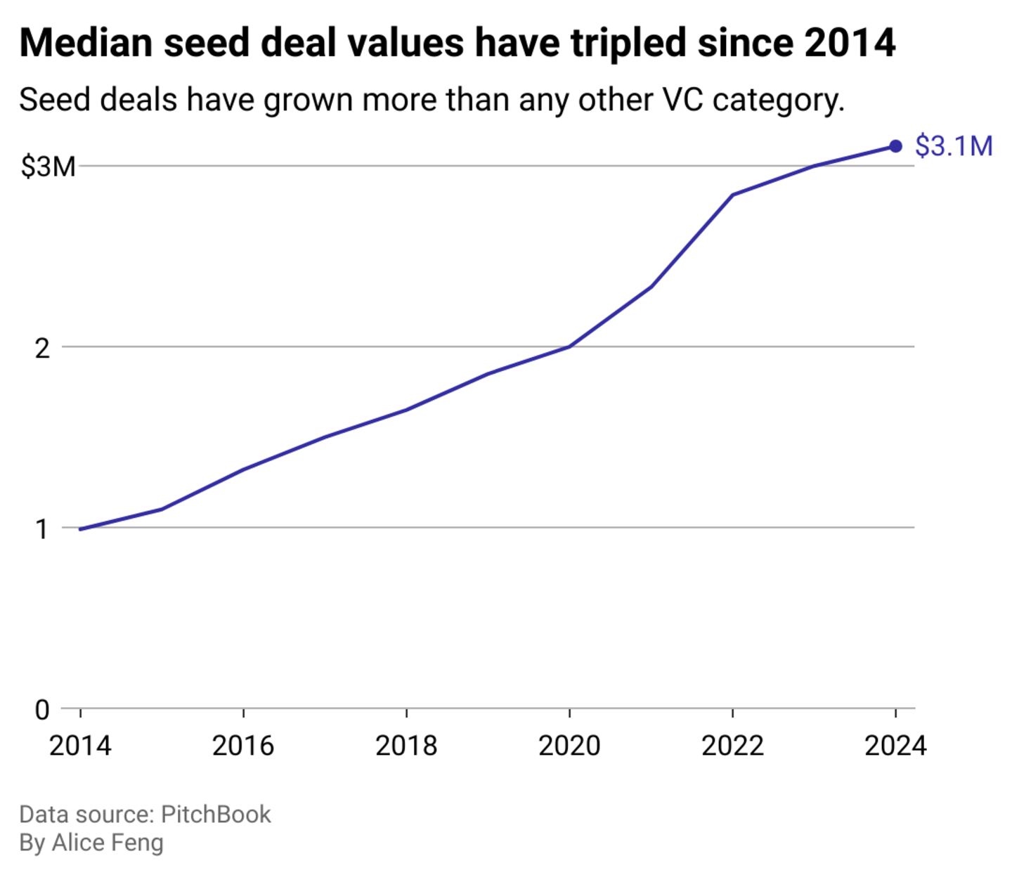 Funding Rounds used data from PitchBook to analyze trends in deal values by startup funding round between 2014 and 2024 and to see what it means for investors.