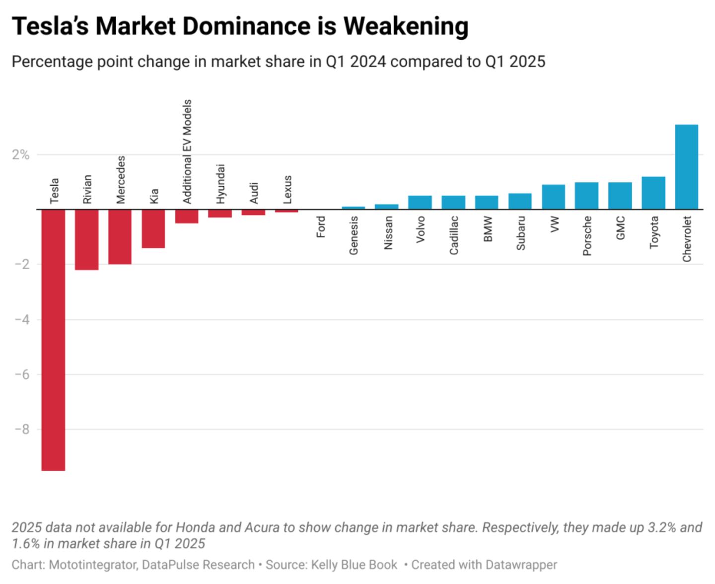 Tesla’s grip on the U.S. EV market is loosening. In Q1 2025, its market share fell to 43.2%, down from 52.7% the previous year—a 9.5-point decline. No other automaker came close to this level of loss. While Tesla lost ground, Chevrolet gained 3.1 points, Toyota and Porsche each climbed by more than 1 point, and other brands like GMC, VW, and Subaru made notable gains.