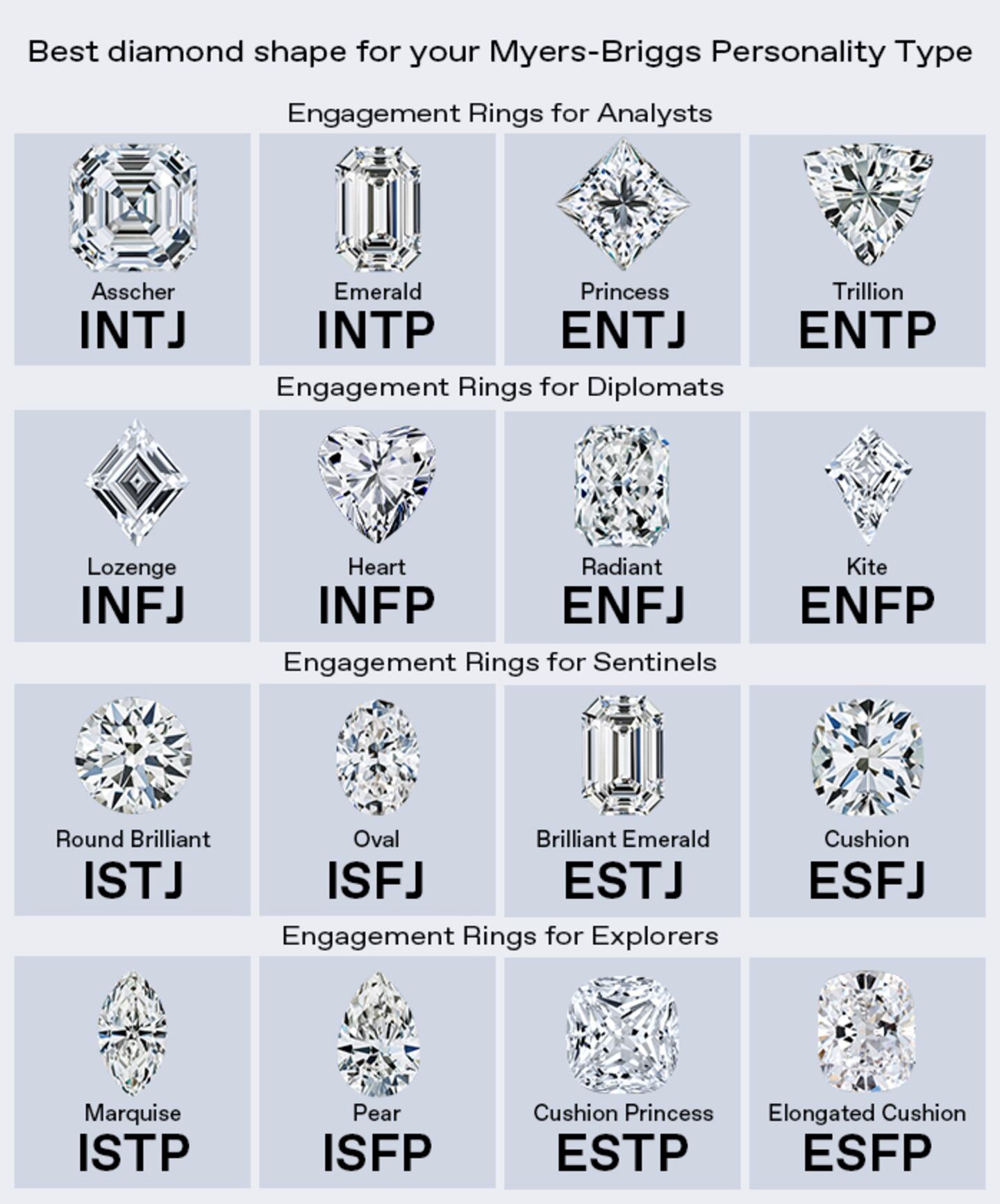 Your engagement ring is more than just a beautiful piece of jewelry—it's a reflection of your personality, values, and love story. The Myers-Briggs Type Indicator, or MBTI, provides insights into how individuals perceive the world and make decisions. Pairing your MBTI type with an engagement ring ensures your ring resonates with your true essence and unique style. VRAI, a fine jewelry brand that features lab-grown diamonds, takes a deeper look at the styles that each Myers-Brigg personality type should say yes to.