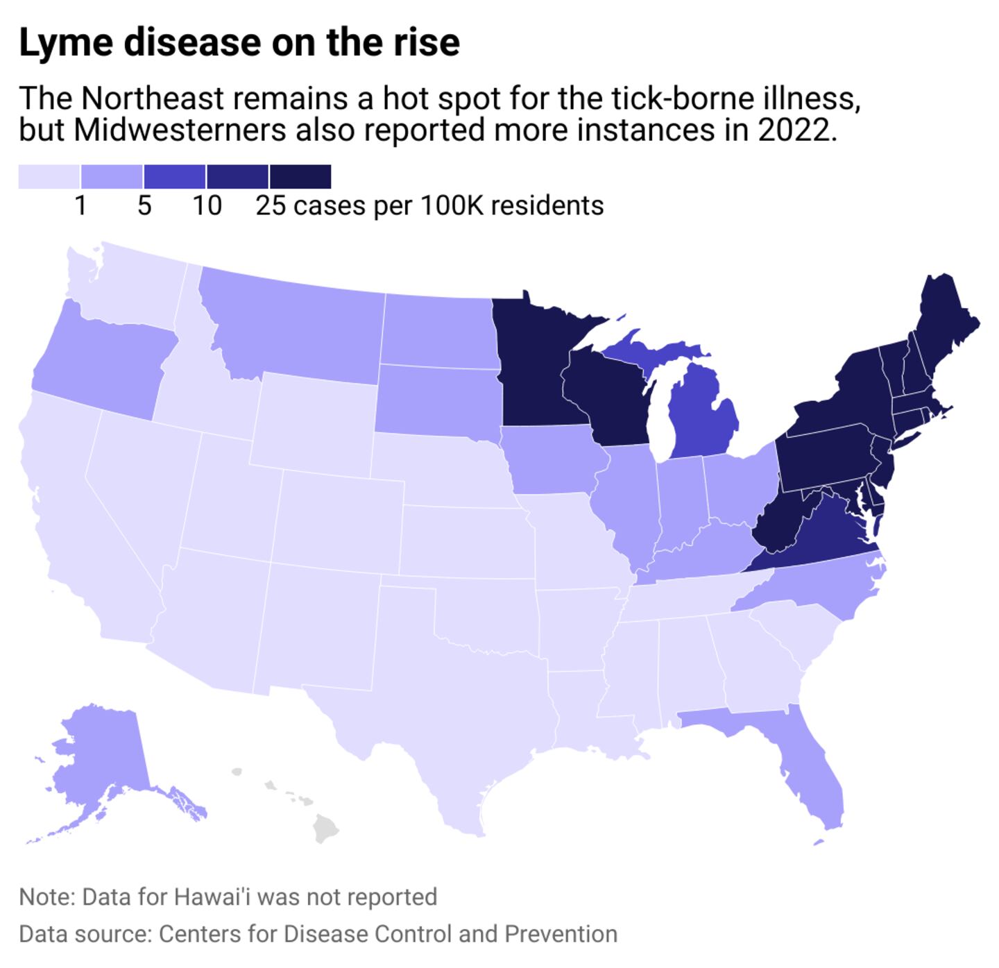 Increased awareness and screening have contributed to reported infections, but most of it can be attributed to a change in how the data is collected. In 2022, the CDC and the Council of State and Territorial Epidemiologists updated their criteria for regions with high tick populations to be based solely on lab testing. Previously additional clinical data, including demographic information and family history, was also required.